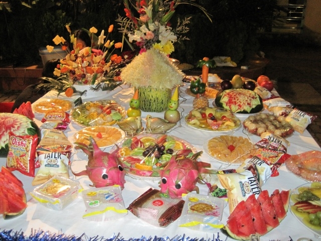 Cỗ mừng Trung thu gồm bánh Trung thu, kẹo, mía, bưởi, và các thứ hoa quả khác nữa. Đây là dịp để con cái hiểu được sự săn sóc quí mến của cha mẹ đối với mình một cách cụ thể. Vì thế, tình yêu gia đình lại càng khăng khít thêm. Cũng trong dịp này người ta mua bánh trung thu, trà, rượu để cúng tổ tiên, biếu ông bà, cha mẹ, thầy cô, bạn bè, họ hàng, và các ân nhân khác để tỏ lòng biết ơn.