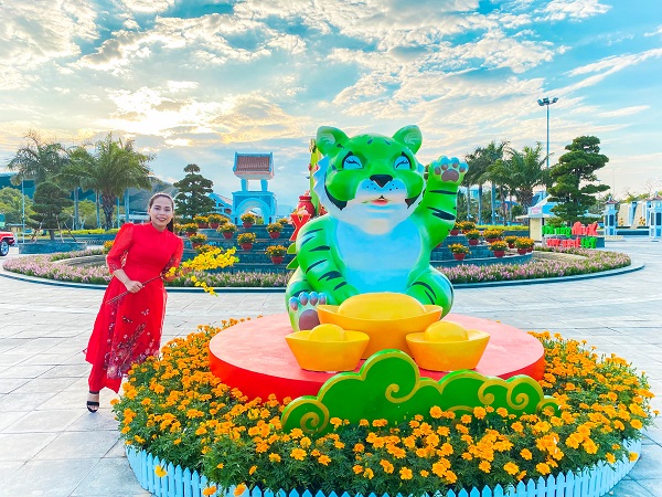 Dù không vận hành, đón khách dịp Tết Nguyên Đán 2022, song Công viên Châu Á (Đà Nẵng) vẫn tăng cường chăm sóc cảnh quan, trồng thêm nhiều hoa và trang trí các tiểu cảnh xinh đẹp trong khuôn viên để kiến tạo không gian xuân ấn tượng cho du khách check-in, chụp hình. Ấn tượng nhất là tiểu cảnh “Ngũ hổ nghênh xuân” vô cùng độc đáo, được trang trí sắc màu bắt mắt, đại diện cho các hành phong thủy: Kim, Mộc, Thủy, Hỏa, Thổ nhằm nguyện cầu cho một năm mới ấm no, đủ đầy, bình an và thịnh vượng.