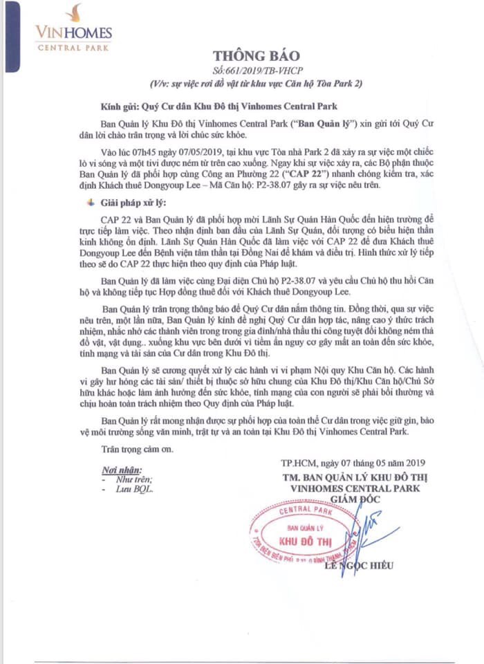 Sáng cùng ngày, đại diện chủ căn hộ P2-38.07 cũng đã có buổi làm việc trực tiếp với BQL Vinhomes Central Park. Sau khi xác minh rõ sự việc, BQL đã yêu cầu chủ căn hộ hủy hợp đồng cho thuê căn hộ với ông Dongyoup Lee.
