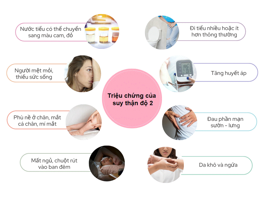 Ở giai đoạn này, người mắc thường không xuất hiện triệu chứng rõ ràng. Việc phát hiện thường khi bệnh tiến triển sang giai đoạn nặng hoặc lúc thực hiện xét nghiệm liên quan đến tiểu đường, cao huyết áp. Tuy nhiên, người bệnh có thể nhận biết một số dấu hiệu suy thận độ 2 như sau: