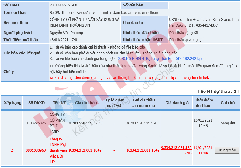 Bất chấp việc lập hồ sơ mời thầu không đúng quy định, UBND xã Thái Hòa vẫn tổ chức đấu thầu trên Hệ thống mạng đấu thầu Quốc gia. Trên hệ thống mạng đấu thầu quốc gia có 2 nhà thầu tham dự gói thầu này là công ty cổ phần Poli Land được thành lập từ năm 2009 và Công ty TNHH MTV Việt Đức HD được thành lập năm 2013. Nếu nói riêng về chỉ số tiết kiệm hay kinh nghiệm tham gia dự thầu hoạt động đấu thầu qua mạng thì Công ty Cổ Phần POLILAND có phần nhỉnh hơn Công ty TNHH MTV Việt Đức HD. Công ty Cổ Phần POLILAND đã tham gia 148 gói thầu qua mạng và đối với gói thầu này đặt giá dự thầu là 8.784.550.599 VNĐ trong khi Công ty TNHH MTV Việt Đức HD tham gia chỉ đúng 4 gói thầu và có giá dự thầu là 9.334.313.081 VNĐ.