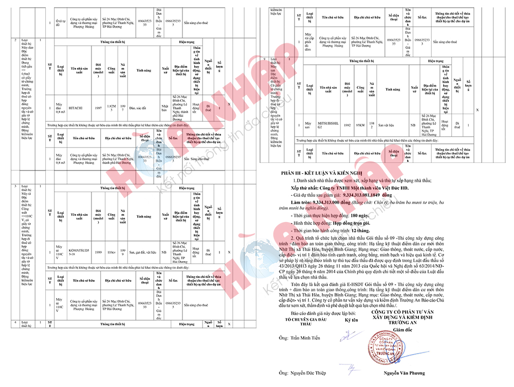 Lại nói sâu hơn về việc đánh giá nhà thầu giữa hai công ty là Công ty TNHH MTV Việt Đức HD và Công ty Cổ Phần POLILAND thì Công ty cổ phần tư vấn xây dựng và kiểm định Trường An vào ngày 5/2/2021 đã có tờ trình về việc đề nghị phê duyệt kết quả lựa chọn nhà thầu. Theo đó căn cứ kêt quả mở thầu thì có 02 nhà thầu tham dự, trong đó có nhà thầu Công ty Cổ Phần POLILAND có giá dự thầu thấp nhất được xếp hạng thứ nhất và lựa chọn đánh giá về tính hợp lệ, năng lực và kinh nghiệm, kỹ thuật. Tuy nhiên nhà thầu Công ty Cổ Phần POLILAND được đánh giá là không đạt về năng lực thiết bị thi công E-HSDT nên bị loại. Điểm đặc biệt là các thiết bị máy ủi, máy đào và máy san của Công ty Cổ Phần POLILAND sử dụng đều có năm sản xuất là 2005 lại bị đánh không đạt trong khi của Công ty TNHH MTV Việt Đức HD lại được sản xuất năm 1997, 1999 và 1982 lại đạt.