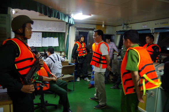 | Cơ quan chức năng làm việc với những người liên quan trên hai tàu biển buôn lậu xăng dầu - Ảnh: N.C. |