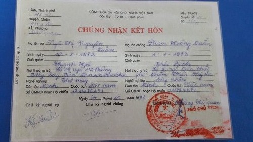 Chứng nhận kết hôn của chị Ngô Thị Nguyên Xuân và anh Phạm Hoàng Tuấn. Ảnh: Chị Xuân cung cấp