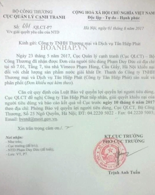 Sau đó, Cục Quản lý cạnh tranh - Bộ Công thương đã có văn bản số 691/QLCT-P7 về việc giải quyết yêu cầu của người tiêu dùng gửi tới Công ty TNHH Thương mại và Dịch vụ Tân Hiệp Phát.