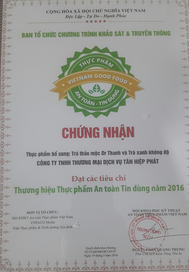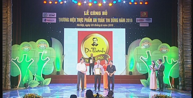 Danh mục "Thương hiệu Thực phẩm an toàn tin dùng 2016" do Viện Thực phẩm và Dinh dưỡng Gia đình và Hội Khoa học Kỹ thuật An toàn thực phẩm Việt Nam công bố. Mục đích nhằm hưởng ứng Tháng hành động vì chất lượng an toàn vệ sinh thực phẩm 2016 của Chính phủ phát động và thông tin đến người tiêu dùng những sản phẩm thực phẩm an toàn, góp phần bảo vệ sức khỏe người dân, đem lại lợi ích cho xã hội. 2 sản phẩm của Tân Hiệp Phát là Dr. Thanh và Trà xanh Không độ do Việt Nam sản xuất trên dây chuyền Aseptic chiết lạnh vô trùng hiện đại nhất thế giới và hoàn toàn không sử dụng chất bảo quản đã được vinh danh trong hạng mục này.