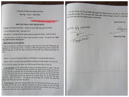 Không chấp nhận kiểu ban hành Quyết định trái pháp luật (vi phạm Điều 371 Bộ Luật Hình sự) của TAND quận Phú Nhuận và không chịu nổi cách hành xử của Thẩm phán Trần Thị Ngọc Trâm, nên ngày 29/1/2018, ông Hiệp đã viết Đơn Khiếu nại QĐ số 01 và Đơn xin thay đổi Thẩm phán.