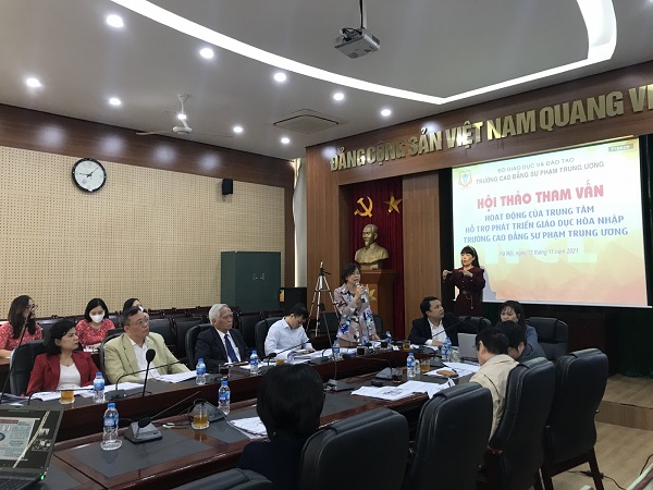 Bà Trịnh Thị Xim - Phó Hiệu trưởng Trường CĐSPTƯ, đưa ra quan điểm: Số trẻ kiếm thính cũng như tỉ lệ trẻ rối loạn phát triển hằng năm ở Việt Nam rất cao. Vì vậy cần phát triển mô hình hỗ trợ trẻ đặc biệt một cách hệ thống từ Trung ương đến tỉnh/vùng và xuống đến trường học. Cần mạng lưới Trung tâm Hỗ trợ phát triển GDHN, có chức năng hỗ trợ giáo dục trẻ khuyết tật tại trường học, cộng đồng, gia đình.