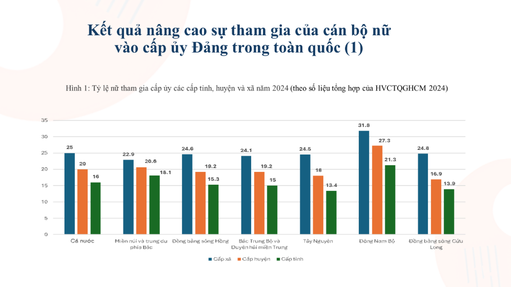 Theo báo cáo về kết quả nâng cao sự tham gia của cán bộ nữ vào cấp ủy Đảng trong toàn quốc, Tỷ lệ nữ tham gia cấp ủy các cấp ở khu vực Đông Nam Bộ cao nhất (lần lượt 31,8%, 27,3%, 21,3%) và thấp nhất đối với cấp xã là MNTDPB 22,9%, cấp huyện là ĐBSCL 16,9% và cấp tỉnh là khu vực Tây Nguyên.
