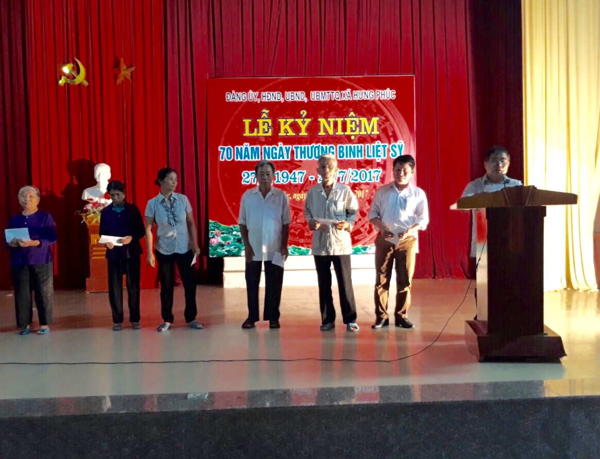 Chiều cùng ngày thực hiện kế hoạch số: 93/KH - UBND ngày 16/5/2017 của UBND Huyện Hưng Nguyên. Đảng Ủy, HĐND, UBND, UBMTTQ xã Hưng Phúc đã tổ chức lễ kỷ niệm 70 năm ngày Thương binh - Liệt sĩ, đây cũng là dịp để tri ân các anh hùng Liệt sĩ và thể hiện lòng biết ơn sâu sắc của mọi cán bộ, Đảng viên và nhân dân đối với người có công với cách mạng.