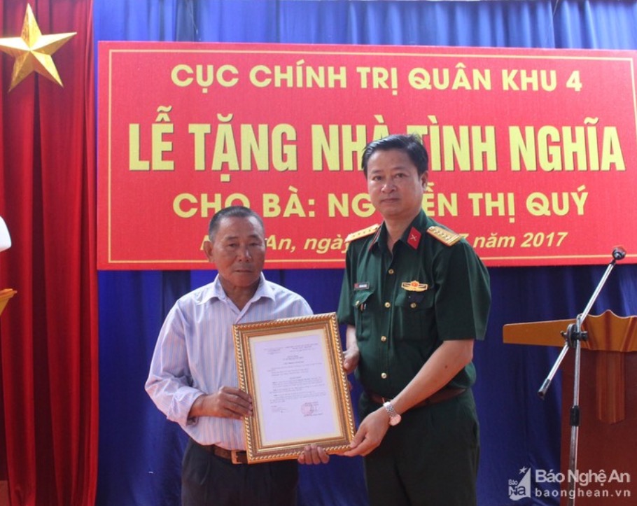 | Lãnh đạo cục Chính trị Quân khu 4 trao tặng nhà tình nghĩa cho gia đình. |