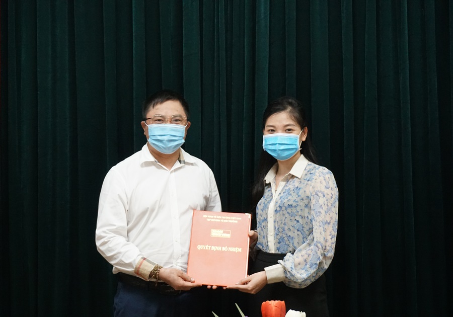 Nhà báo Nguyễn Tường Quân, Phó Tổng Biên tập Tạp chí Kinh tế Môi trường (bên trái) trao Quyết định bổ nhiệm cho Nhà báo Vương Thị Liễu.