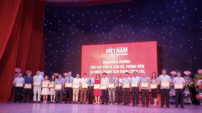 Tặng bằng khen và hoa cho các Nhà báo, phóng viên thuộc Tạp chí Việt Nam Hội nhập có thành tích tốt. (Ảnh: Tiến Thành)
