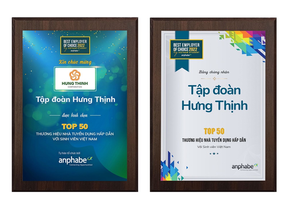 Anphabe công bố Tập đoàn Hưng Thịnh đã được sinh viên khối ngành Kiến trúc - Thiết kế - Xây dựng bình chọn vào “Top 50 Thương hiệu nhà tuyển dụng hấp dẫn với sinh viên Việt Nam 2022”. Kết quả này dựa trên bình chọn của sinh viên Việt Nam về từng thương hiệu nhà tuyển dụng qua 5 giai đoạn hấp dẫn nhân tài: Awareness – Nhận biết, Interest – Quan tâm, Action – Sẵn sàng ứng tuyển, Desire – Khát khao và 1st choice – Ưu tiên chọn.