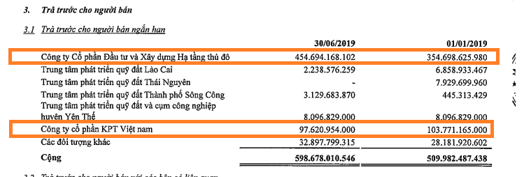 Bên cạnh thông tin về giao dịch giữa Kosy, công ty do ông Nguyễn Việt Cường làm Chủ tịch và Công ty ALI do ông Nguyễn Thái Luyện làm đại diện pháp lý, báo cáo tài chính 6 tháng đầu năm 2019 của Kosy thể hiện rõ mối quan hệ giữa doanh nghiệp này với Công ty CP Đầu tư và Xây dựng hạ tầng Thủ đô và Công ty CP KPT Việt Nam. Cụ thể, theo khoản mục trả trước cho người bán ngắn hạn với giá trị lần lượt là 454,6 tỷ đồng, tăng 100 tỷ đồng so với thời điểm đầu năm 2019, và 97,6 tỷ đồng, giảm 5 tỷ đồng so với thời điểm đầu năm 2019.