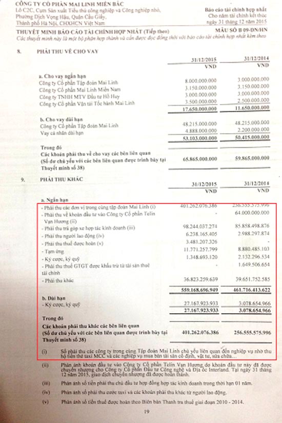 Báo cáo kiểm toán của MLMB năm 2015 cho thấy, số phải thu các công ty trong cùng Tập đoàn Mai Linh chủ yếu liên quan đến nghiệp vụ nhờ thu hộ tiền thẻ taxi MCC… lên tới trên 401 tỷ đồng.