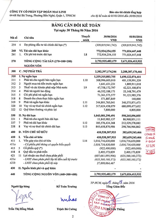 Tính tới quý 2/2016, tổng các khoản nợ phải trả của Công ty Cổ phần Tập đoàn Mai Linh là hơn 2.382 tỷ đồng, tăng 94 tỷ đồng so với quý trước.
