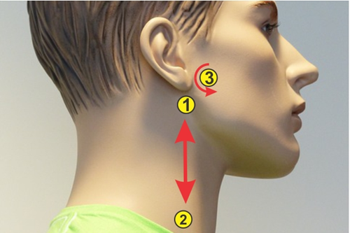 Cách thực hiện: Dùng ngón tay mát-xa nhẹ nhàng lên xuống từ vị trí dưới ráy tai (1), dọc cổ đến (2). Thực hiện lặp lại 10 lần mỗi lượt. Dùng ngón tay xoay nhẹ nhàng vòng tròn ngược chiều kim đồng hồ vị trí bên cạnh tai (số 3).