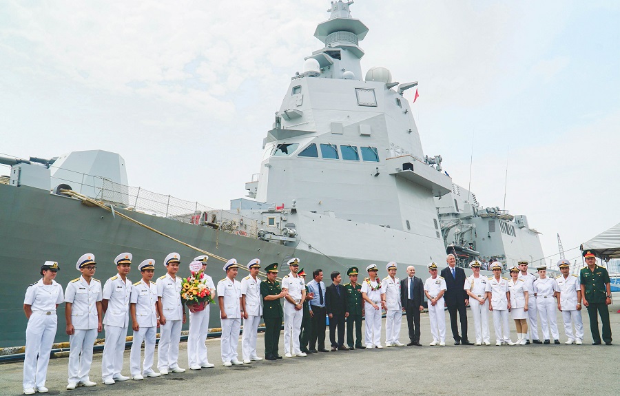 Các đại biểu Việt Nam chụp hình cùng thủy thủ đoàn tàu Morosini.
