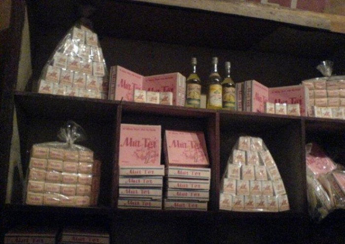 Cửa hàng tạp hóa bán mứt kẹo, rượu Tết. Thời bấy giờ rượu Nàng Hương có lẽ là loại rượu xịn nhất.