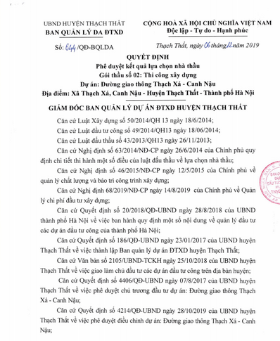 Theo đó, ngày 7/11/2019, UBND huyện Thạch Thất phê duyệt kế hoạch lựa chọn nhà thầu của dự án. Theo quyết định, dự án được chia được chia làm 4 gói thầu khác nhau. Trong đó, gói thầu số 02: Thi công xây dựng thực hiện qua hình thức lựa chọn nhà thầu là đấu thầu rỗng rãi trong nước, không sơ tuyển, qua mạng. Công ty Cổ phần Xây dựng Phát Triển 68 được chỉ định là đơn vị tư vấn lập và đánh giá hồ sơ thầu.