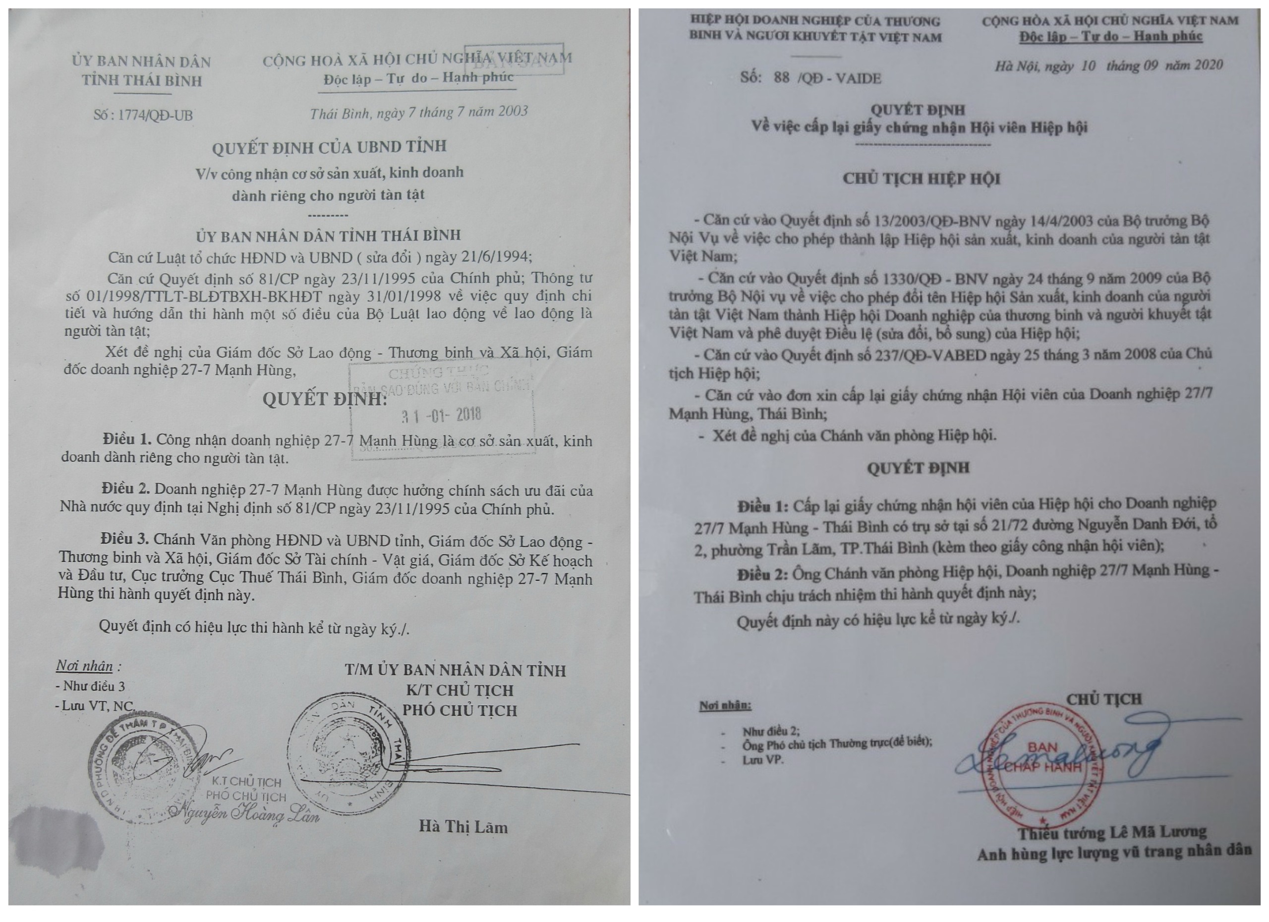 Quyết định của UBND tỉnh công nhận DN 27-7 Mạnh Hùng là cơ sở sản xuất, kinh doanh dành riêng cho người tàn tật (ảnh trước) và là Hôi viên VAIDE (ảnh sau)