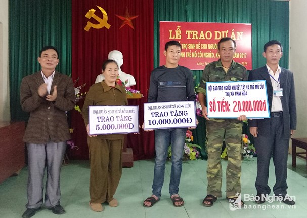 Dịp này có 7 người khuyết tật, trẻ mồ côi đặc biệt khó khăn trên địa bàn xã Đông Hiếu được hỗ trợ. Trong đó hỗ trợ vốn chăn nuôi bò sinh sản cho 2 hộ mỗi hộ 10 triệu đồng; hỗ trợ buôn bán nhỏ cho 2 hộ (5 triệu đồng/hộ) và hỗ trợ xây mới nhà ở cho 3 hộ (20 triệu đồng/hộ).