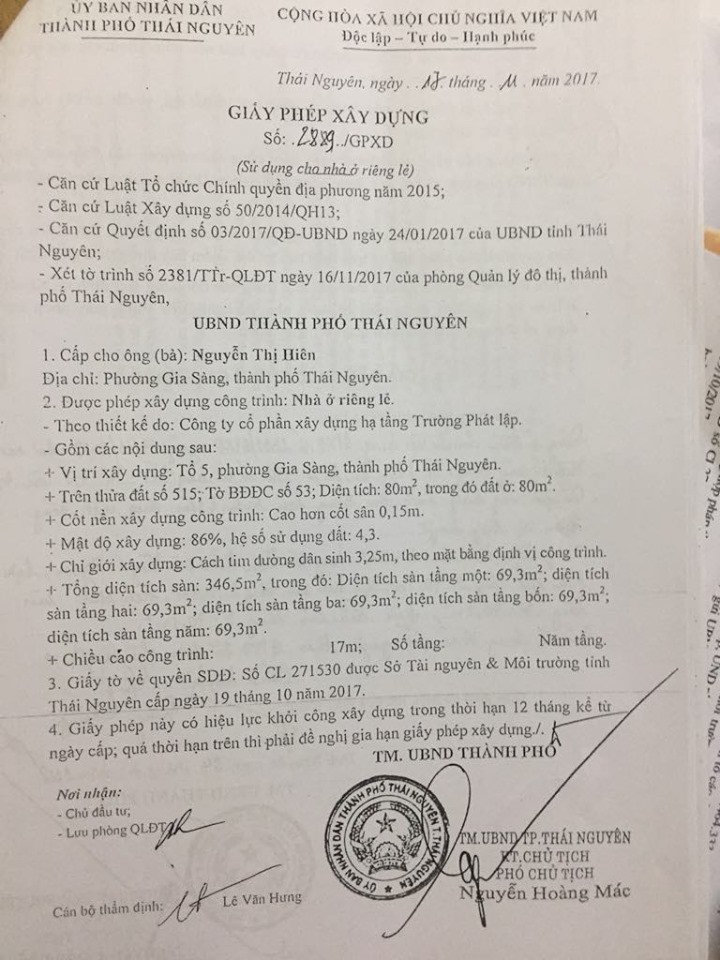Xét Tờ trình số 2381/TTr-QLĐT ngày 16/11/2017 của Phòng Quản lý đô thị TP Thái Nguyên, ngày 17/11/2017 ông Nguyễn Hoàng Mác (Phó Chủ tịch UBND TP Thái Nguyên) đã ký Giấy phép xây dựng số 2889/GPXD cho bà Nguyễn Thị Hiên tại tổ 5, phường Gia Sàng, quy mô công tình 5 tầng với tổng diện tích sàn 346,5 mét vuông.