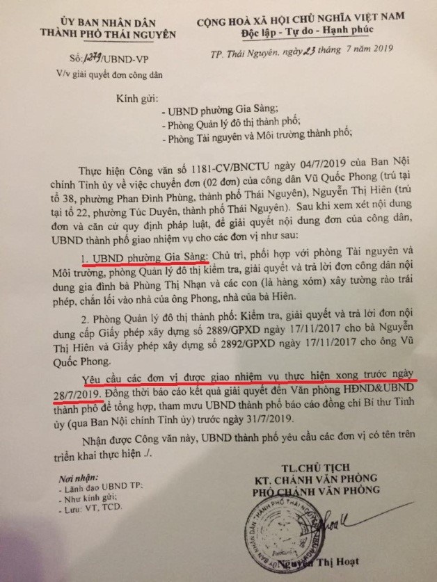 Văn bản chỉ đạo của UBND TP Thái Nguyên nêu rõ thời hạn đến ngày 28/7/2019 nhưng đến nay vẫn chưa được các cơ quan, chính quyền cơ sở giải quyết dứt điểm.