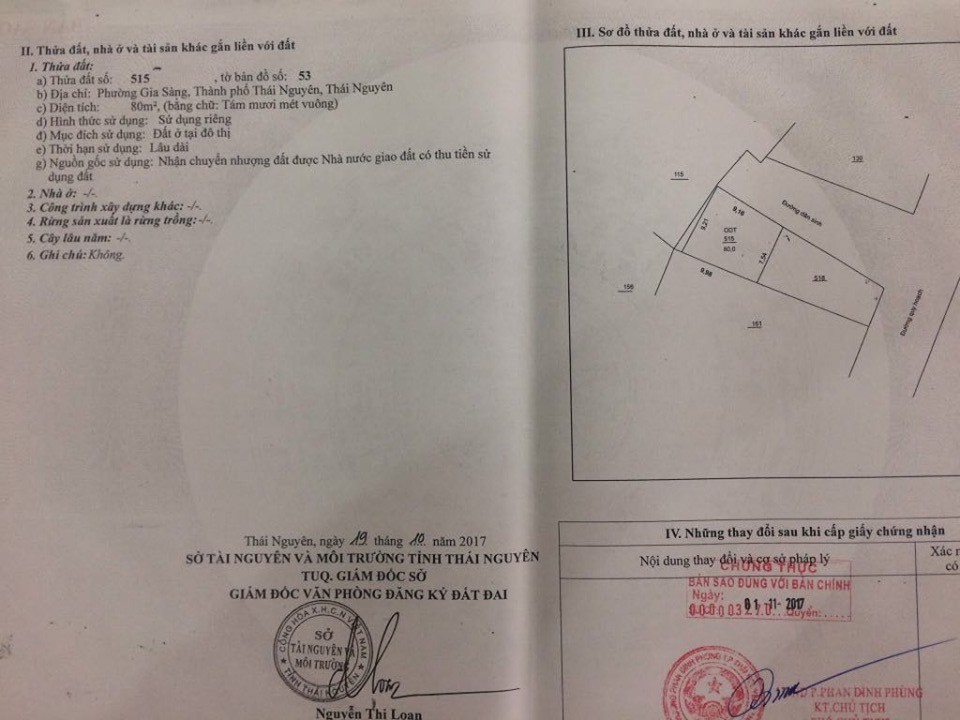 Sau khi trúng đấu giá, ngày 19/10/2017, Giám đốc Văn phòng đăng ký đất đai (Sở Tài nguyên và Môi trường tỉnh Thái Nguyên) đã ký Giấy chứng nhận quyền sử dụng đất, quyền sở hữu nhà ở và tài sản khác gắn liền với đất số hiệu CL 271531 cho bà Nguyễn Thị Hiên. Theo đó, thửa đất số 515, tờ bản đồ số 53 thuộc tổ 5 phường Gia Sàng, TP Thái Nguyên thuộc quyền sở hữu của bà Nguyễn Thị Hiên có diện tích 80 mét vuông, sử dụng riêng và là đất ở đô thị được sử dụng lâu dài.