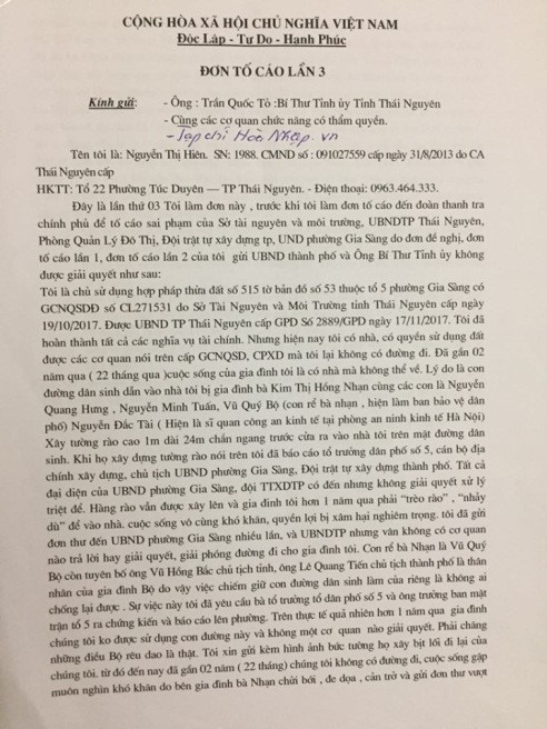 Sau khi xem xét đơn thư và tài liệu, thiết nghĩ, đã đến lúc các cơ quan chức năng của TP Thái Nguyên, tỉnh