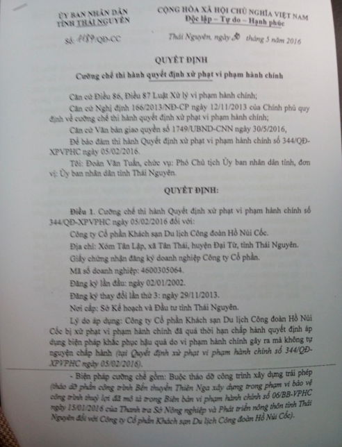 Trước sự việc trên, ngày 30/5/2016, UBND tỉnh Thái Nguyên đã ban hành Quyết định số 1184/QĐCC Quyết định cưỡng chế thi hành quyết định xử phạt vi phạm hành chính đối với Công ty CP Khách sạn du lịch công đoàn Hồ Núi Cốc.