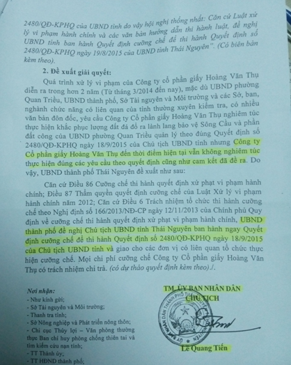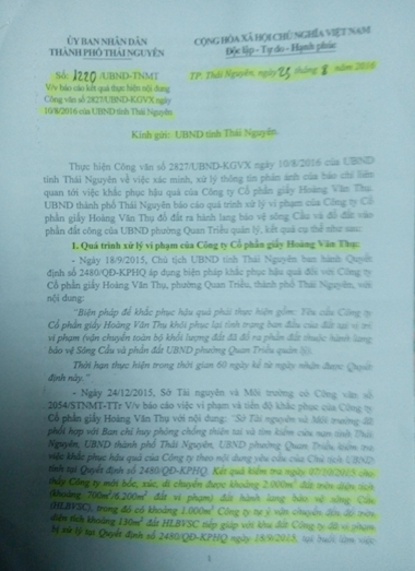 Ngày 10/8/2016, sau khi tiếp nhận thông tin từ báo chí và dư luận, ngày 23/8/2016, ông Lê Quang Tiến- Chủ tịch UBND TP Thái Nguyên- đã ký Văn bản số 1220/UBND-TNMT gửi UBND tỉnh Thái Nguyên báo cáo kết quả thực hiện nội dung Công Văn số 2828/UBND-KGVX ngày 10/8/2016 của UBND tỉnh Thái Nguyên, nêu rõ quá trình xử lý vi phạm của Công ty CP Giấy Hoàng Văn Thụ.