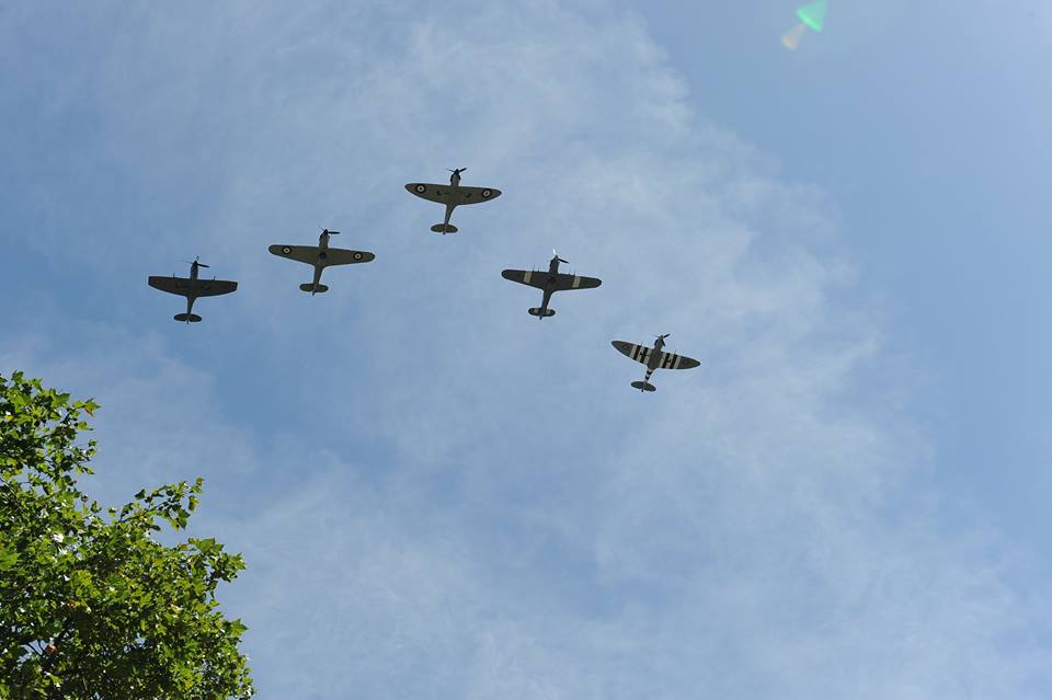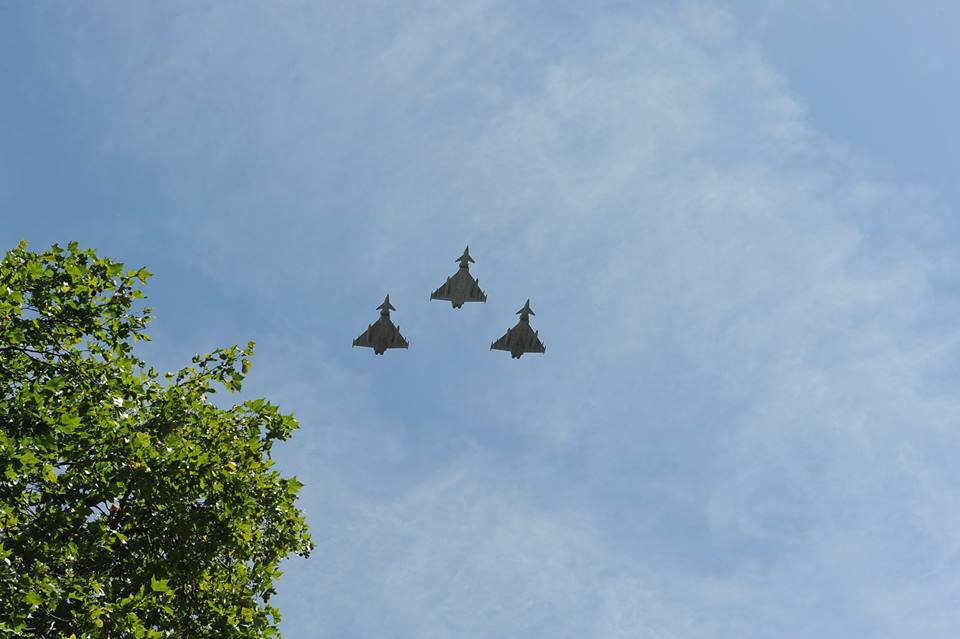 | Trên bầu trời thì đủ loại máy bay từng tham chiến trong cuộc chiến ấy với hầu hết các thế hệ máy bay chiến đấu sau Thế chiến thứ II cho đến nay của Quân đội Hoàng gia Vương quốc Anh bay duyệt theo đội hình; |