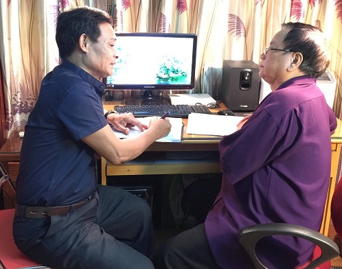 | Tác giả đang chăm chú nghe và ghi lại tư liệu mà NS Nguyễn văn Liền kể |