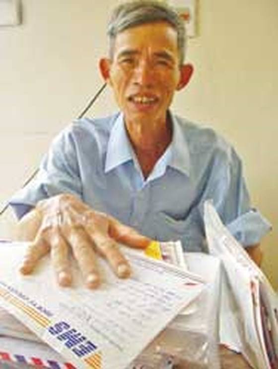 | Ông Lê Văn Cam bên chồng thư hồi âm của thân nhân liệt sĩ. |