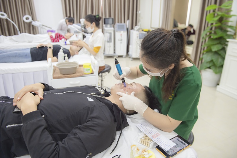 Chuyên viên tiến hành phi kim để đưa tinh chất điều trị vào da, đẩy lùi tình trạng mụn.
