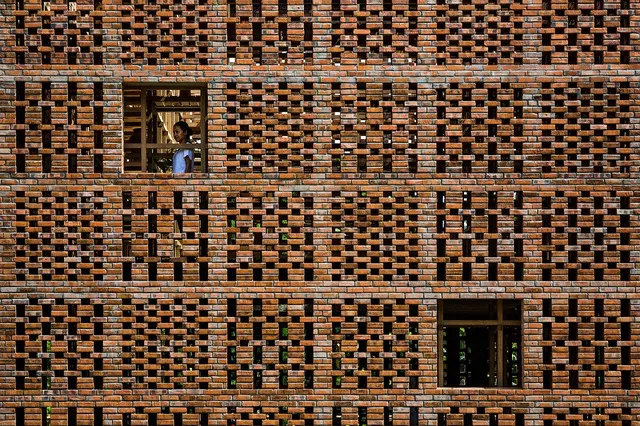 Ở bên ngoài là bức tường bằng gạch được xây thành từng ô đều đặn.