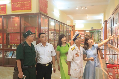 Đoàn chăm chú theo dõi, lắng nghe nhân viên Bảo tàng giới thiệu chi tiết về hình ảnh và hiện vật trưng bày tại Bảo tàng