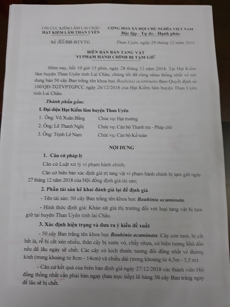 Làm việc với Hạt kiểm lâm huyện Than Uyên, ông Vũ Xuân Bằng (Hạt trưởng), ông Lê Thanh Nghị (KLV) cho biết: hiện nay, toàn bộ số cây hoa ban thu được, Hạt Kiểm lâm đã thanh lý hết rồi. Số cây này cũng đã chở về Mù Căng Chải. Rồi 2 cán bộ này viện dẫn hàng loạt lý do cần phải “thanh lý gấp” như: sợ hàng hóa “ôi thiu”, cây chết héo… nên sau khi thu được, chúng tôi đã phải bán thanh lý ngay. Khi được hỏi về việc cây hoa ban có thuộc nhóm gỗ quý hiếm, cần phải ngăn chặn chặt phá vận chuyển không?, cây hoa ban thuộc nhóm gỗ mấy… ? thì 2 cán bộ này không nhớ nhóm gỗ và cho đó là nhóm gỗ thông thường…