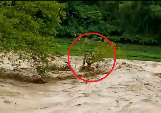 | Sau khi cứu hộ thành công nạn nhân, anh Huy bị mắc kẹt giữa dòng sông Luồng chảy xiết. |