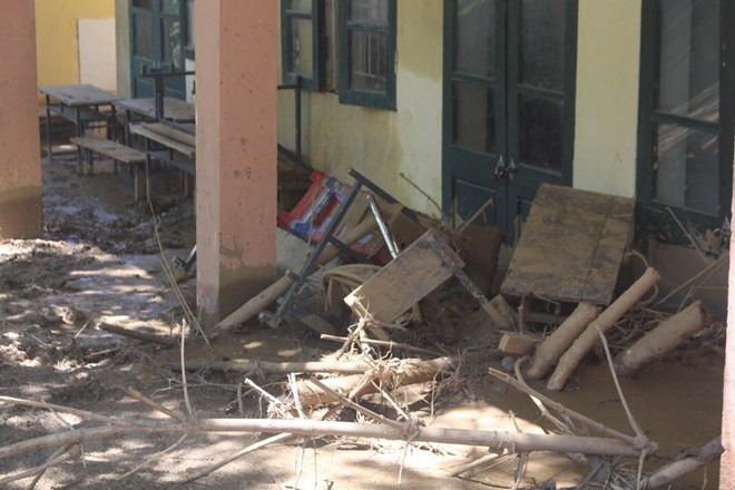 Toàn bộ hai dãy nhà kiên cố với 9 phòng học đã bị bùn đất vùi lấp, nhiều phòng học bị đổ sập; bàn ghế, đồ dùng học tập bị cuốn trôi.