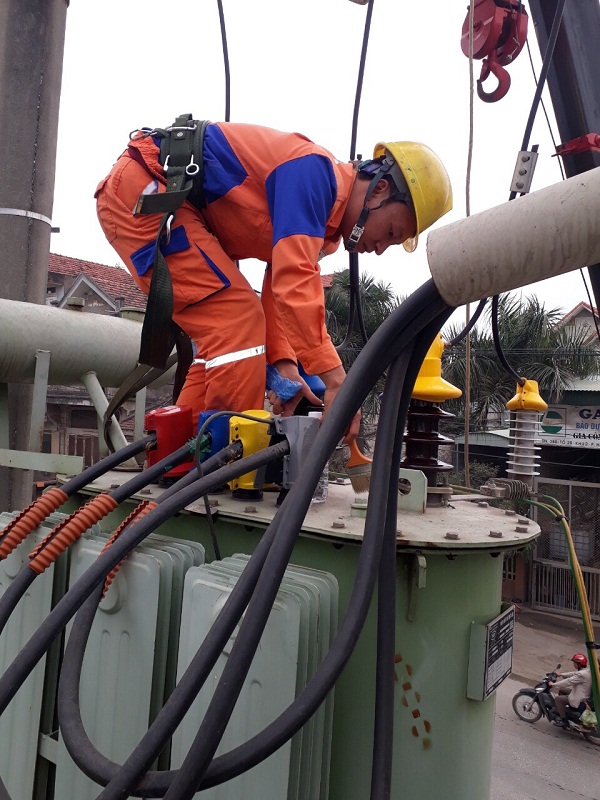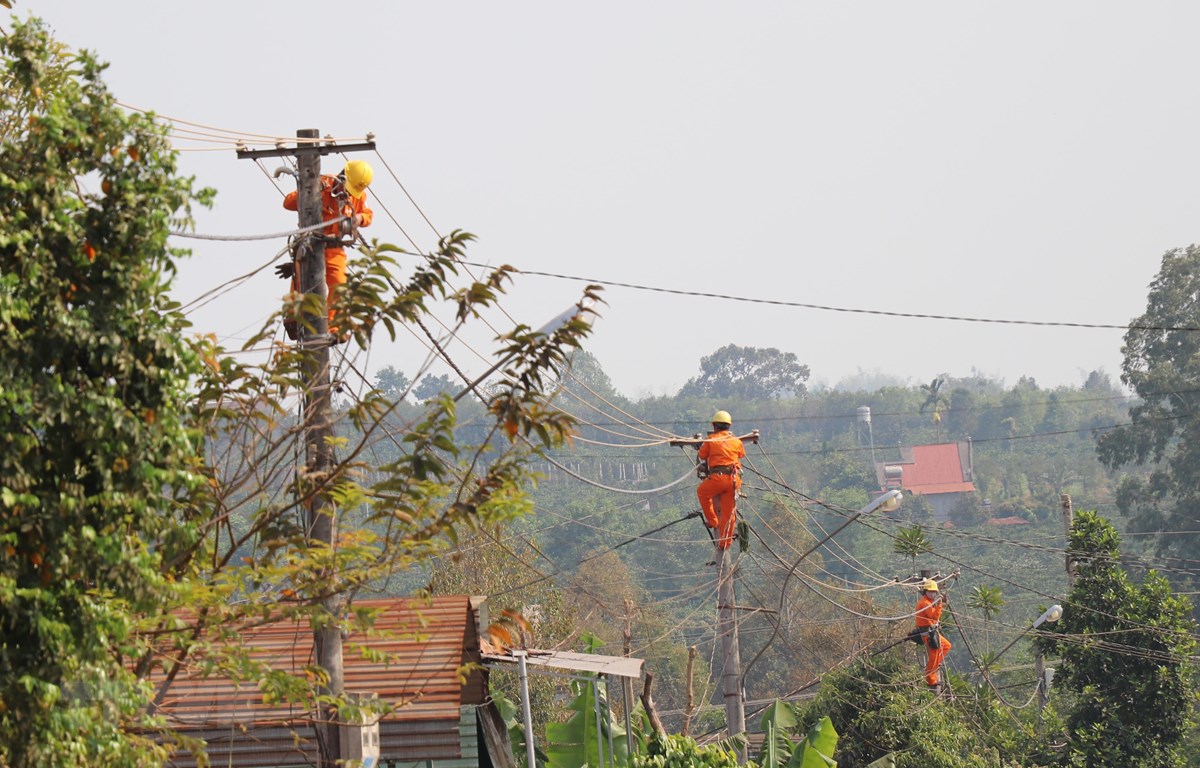 Công nhân ngành điện bảo dưỡng đường dây, nhằm cung cấp điện thông suốt phục vụ khách hàng