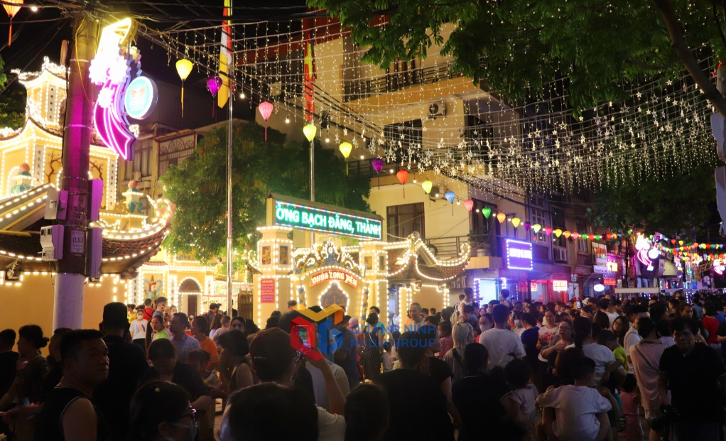 Khu vực chùa Long Tiên, điểm nhấn trên tuyến phố đi bộ được trang trí ánh đèn rực rỡ.