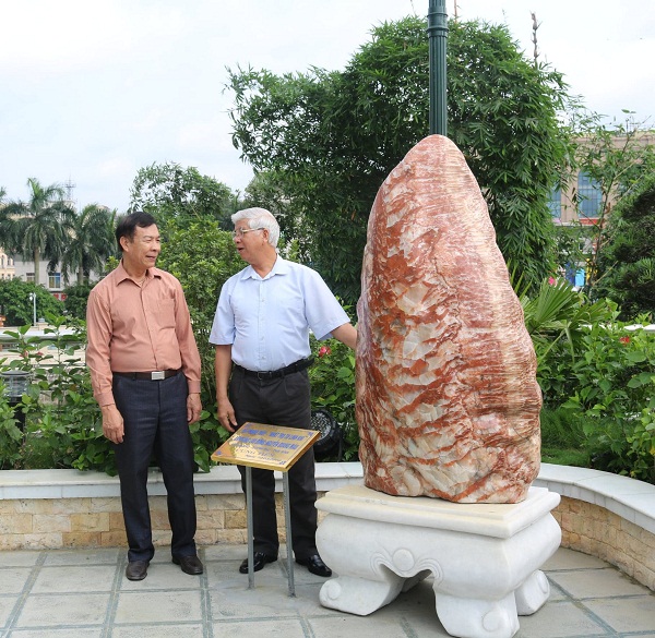 | Anh hùng lao động Nguyễn Quang Mâu (Người đứng bên trái) cùng Đại tá Đặng Toàn Tiến bên Khối đá quý |