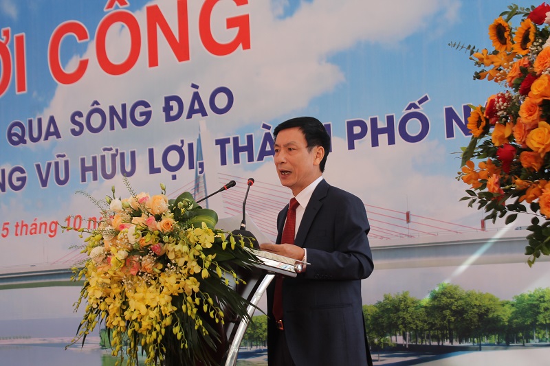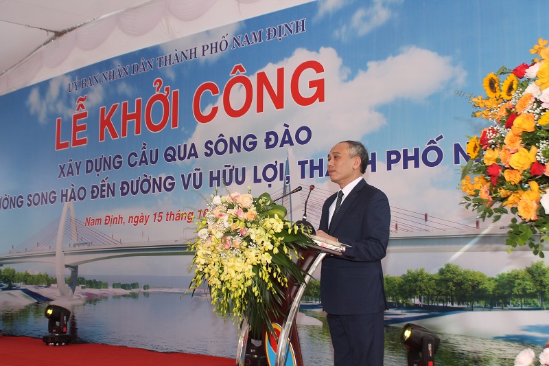 Đại diện nhà thầu phát biểu khẳng định cầu qua sông Đào nối từ đường Song Hào đến đường Vũ Hữu Lợi, thành phố Nam Định sẽ được hoàn thành vào cuối năm 2024.