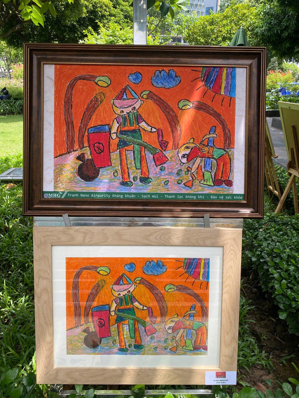 Trên là tranh in từ chất liệu Nano Airpurity, dưới là tranh bé vẽ tham gia chương trình đạt giải