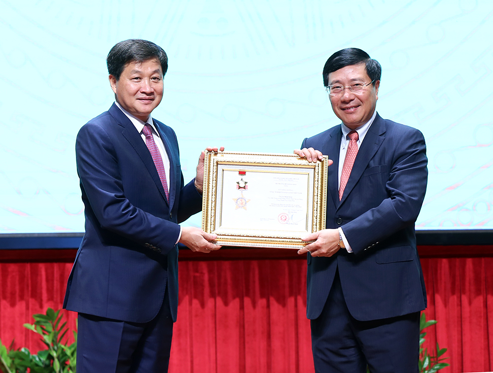 | Phó Thủ tướng Phạm Bình Minh trao tặng Kỷ niệm chương Vì sự nghiệp ngoại giao cho Tổng thanh tra Chính phủ. Ảnh: VGP/Hải Minh |