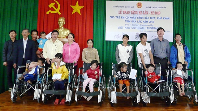 | Quỹ Bảo trợ trẻ em Việt Nam phối hợp Quỹ Bảo trợ trẻ em tỉnh Đác Lắc trao tặng xe lăn, xe đạp cho trẻ em đặc biệt khó khăn ở Đác Lắc. |