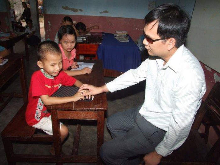 Thầy giáo tâm khiếm thị đem đến kiến thức cho học sinh cùng cảnh ngộ (Ảnh: Tuổi trẻ)